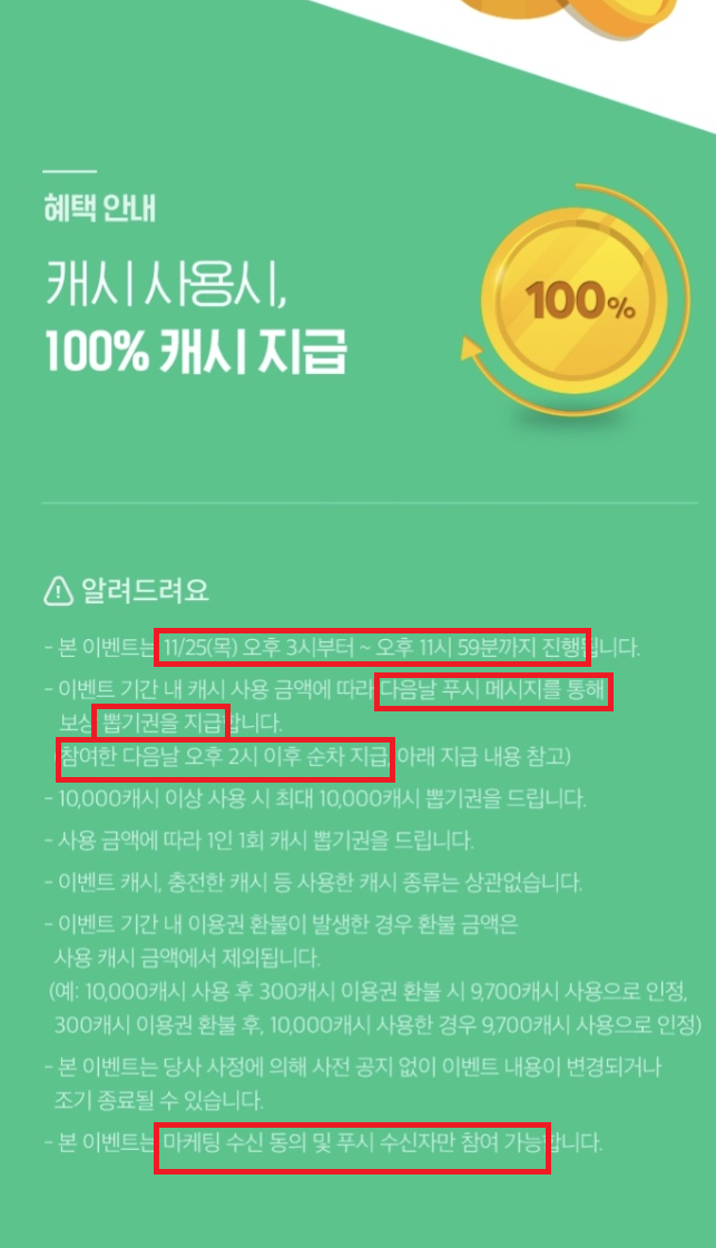 당일 3시부터 다음날 되기 직전까지, 만 원 뽑기권은 다음날 2시 이후 순차 지급, 각종 마케팅 OK 한 사람만 가능...