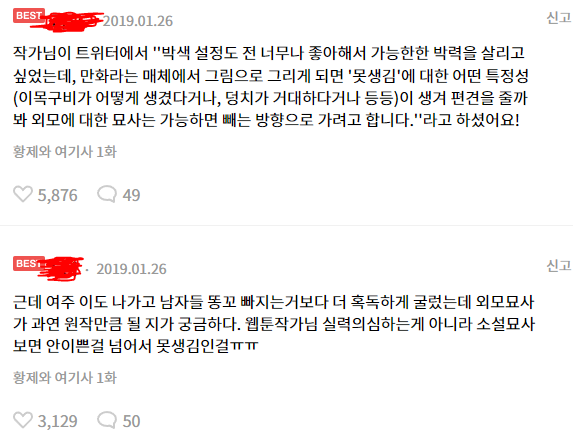 또 덧글을 보니 아래와 같은 정보도 알게 됐다. 원작 안 봐서 몰랐는데 웹툰화를 하시면서 작가님들이 많이 고민하신 듯하다.