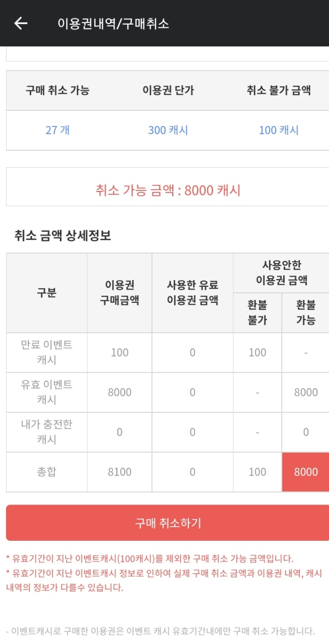 100 캐시가 이벤트 캐시여서 환불 안 됐지만 아직 유효기간이 남아있는 캐시는 환불이 됐다. 얘는 기간 내에 써야겠네.. 하 참. 아무튼 8100, 2700다 환불해줬다.