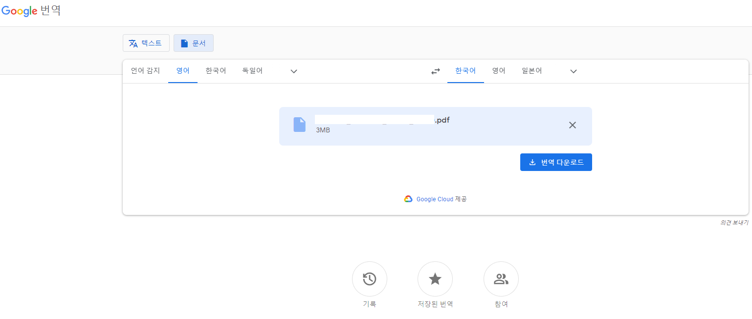 구글 문서 번역이 완료 되면 '번역 다운로드' 버튼이 활성화 됩니다. 눌러주면 됩니다.