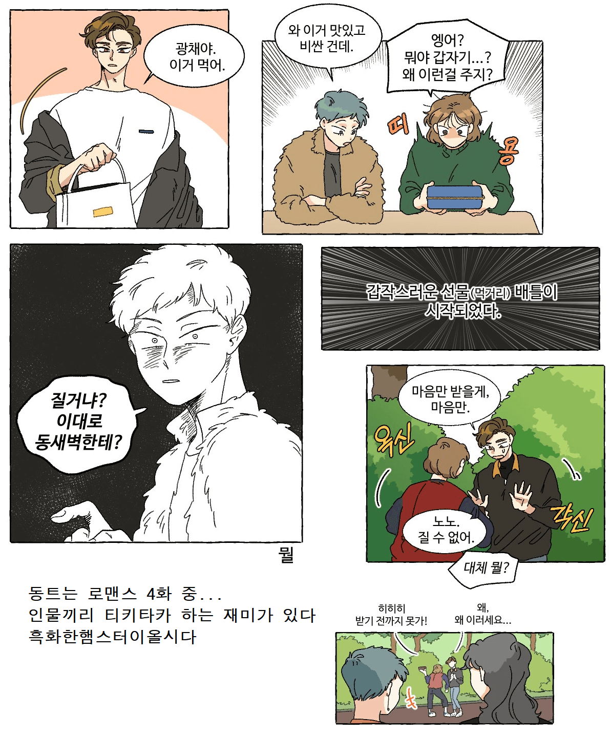 모든 인물들은 대학생이거나 대학 졸업한 지 얼마 안 된(?)... 상태로 거의 대학가가 배경이라고 볼 수 있는 청춘 로맨스입니다. 웹툰 소개글처럼 귀염 뽀짝 청춘 로맨스... 너무 맞는 말입니다.