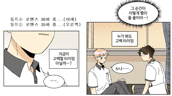 동트는 로맨스의 주 연출 방식은 처음에 주인공 시점으로 쭉 전개를 해나가다가 후반부에 상대방 시점으로 어떤 생각과 마음이었는지를 팍! 알려줍니다. 근데 똑같은 사건인데 인물 간에 느낀 바가 너무 색다르고 상이하니까 그 지점이 너무 재밌어요. 독자 입장에서는 "상대방이 어떻게 생각하고 있는 거지?" 자꾸 궁금하게 해서 다음 화가 엄청 궁금해집니다.