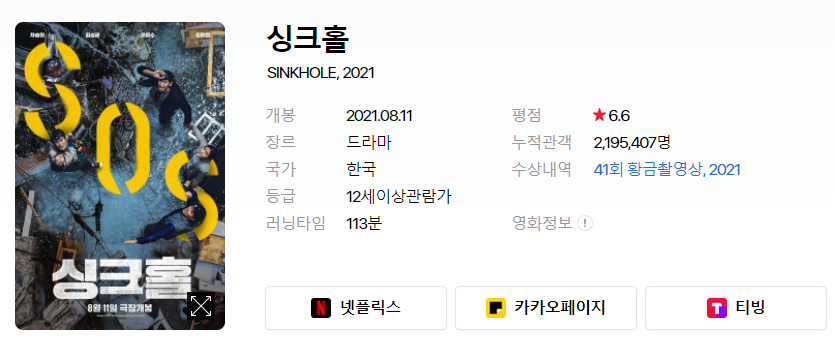8월에 코로나 이후로 처음 영화관에서 영화를 관람했는데 그때 싱크홀이 상영 중이었다. 하지만 나는... 황정민의 인질을 보게 되었고... 싱크홀은 상영을 내리게 되었다. 재난영화라길래 궁금은 했는데... 결국 못 보고 넘어가나 싶었는데 요 근래에 넷플릭스에서 서비스하는 걸 발견!