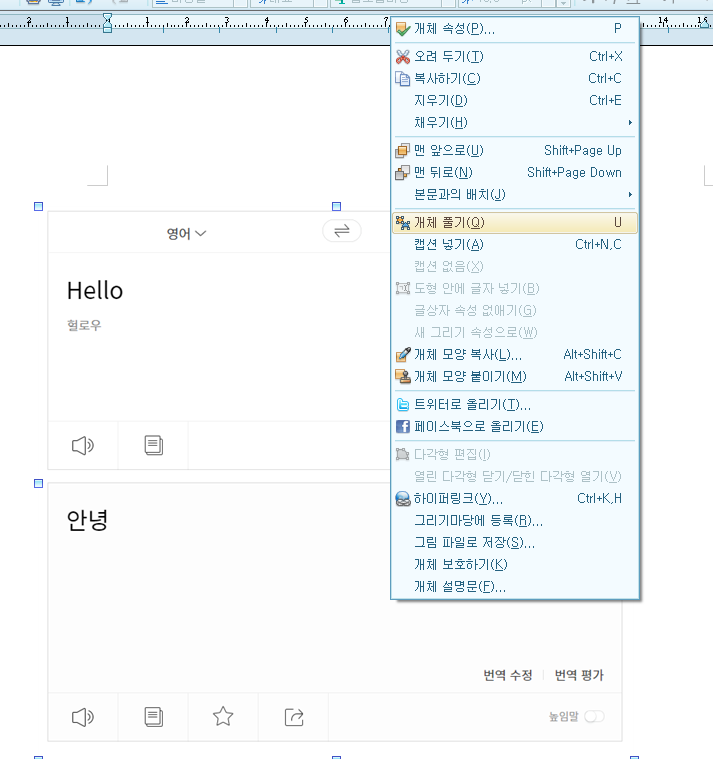 수정할지도 모르겠다... 하시면 한글문서에서 작업하신 뒤 개체 묶기해서 깔끔하게 두시면 됩니다.