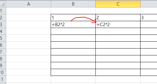 위의 사진과 같이 B3셀에 있는 =B2*2 수식 값을 Ctrl+C(복사)하여 C3셀에 Ctrl+V(붙이기) 했더니 자동으로 수식이 =C2*2로 변경되었다.