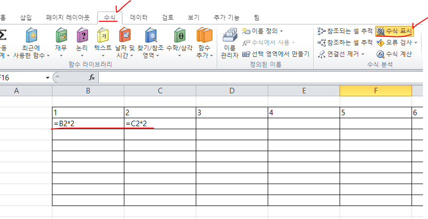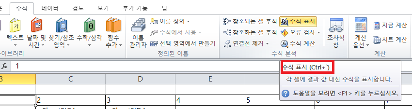 수식 탭에서 수식 분석 쪽으로 가시면 '수식 표시'가 있다. 이걸 눌러주시면 셀 내용에 수식이 있으면 수식 결과가 아니라 수식으로 보인다. 단축키는 Ctrl+` 로 아래 사진을 참고!