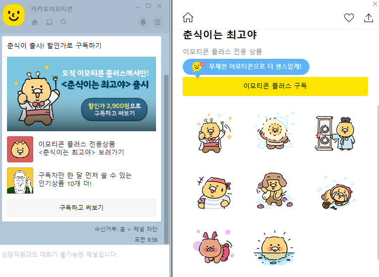 하지만 이모티콘을 다양하게 쓰는 걸 좋아하고 최신 이모티콘 나오는 족족 구매하시는 분들이라면 그냥 이모티콘 플러스 쓰시는 게 낫다.