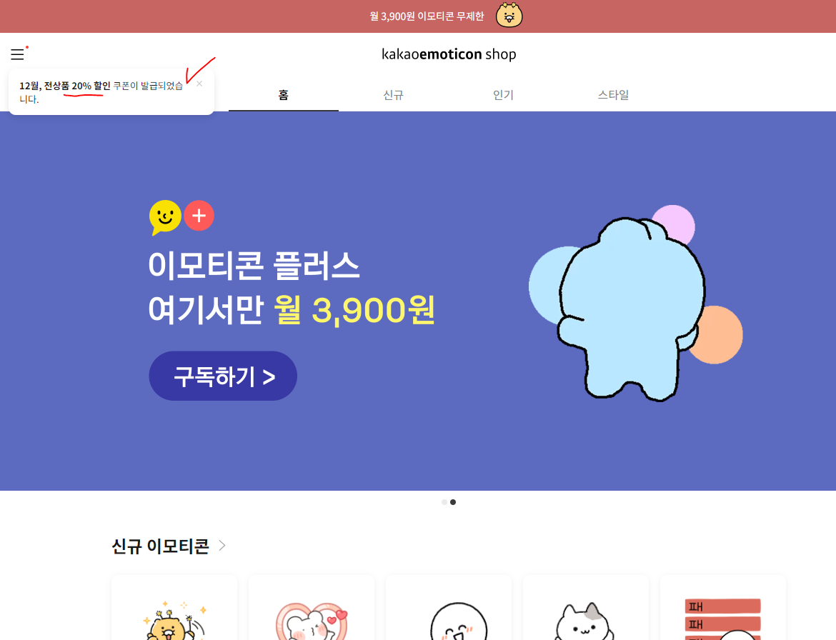 카카오 이모티콘 싸게 사기 (카카오 이모티콘샵, 상시 할인 쿠폰 지급)