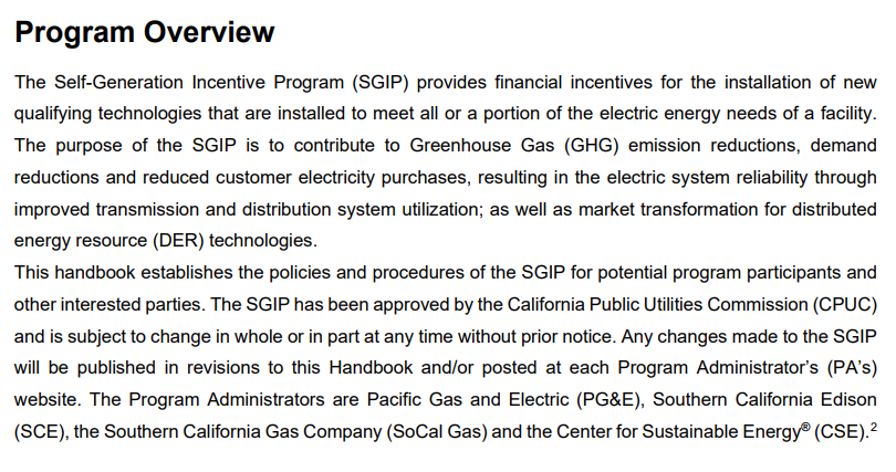 자체 발전 인센티브 프로그램(SGIP)은 시설의 전기 에너지 수요의 전부 또는 일부를 충족시키기 위해 설치된 새로운 적격 기술의 설치에 대해 재정적 인센티브를 제공합니다. SGIP의 목적은 온실 가스(GHG) 배출 감소, 수요 감소 및 고객 전기 구매 감소에 기여하여 전송 및 배전 시스템 활용도를 개선하여 전기 시스템 신뢰성을 높이는 것입니다. 분산 에너지 자원(DER) 기술에 대한 시장 변화뿐만 아니라. 이 핸드북은 잠재적인 프로그램 참가자 및 기타 이해 당사자를 위한 SGIP의 정책 및 절차를 설정합니다. SGIP는 CPUC(California Public Utilities Commission)의 승인을 받았으며 사전 통지 없이 언제든지 전체 또는 일부가 변경될 수 있습니다. SGIP에 대한 모든 변경 사항은 이 핸드북의 개정판에 게시되거나 각 프로그램 관리자(PA) 웹사이트에 게시됩니다. 프로그램 관리자는 Pacific Gas and Electric(PG&E), Southern California Edison(SCE), Southern California Gas Company(SoCal Gas) 및 Center for Sustainable Energy®(CSE)입니다.