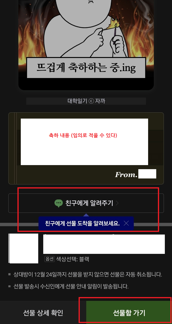 받는 사람한테 별도 안내된다고만 적혀 있고 카톡으로 알려주기 버튼 따위는 발견할 수 없었다.
