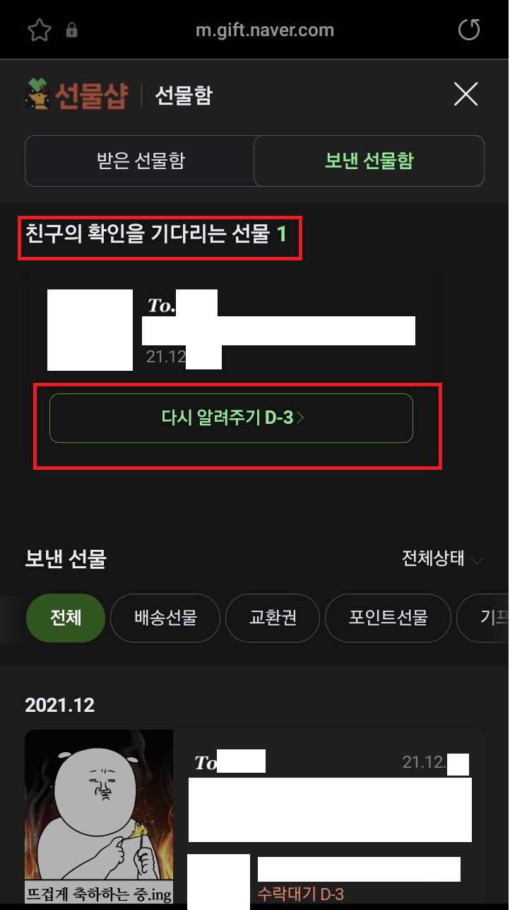 아무튼 '네이버페이 홈> 선물함> 보낸선물' 쪽으로 들어가면 되는 것이었다. 선물함...이란게 있었던 것이다.