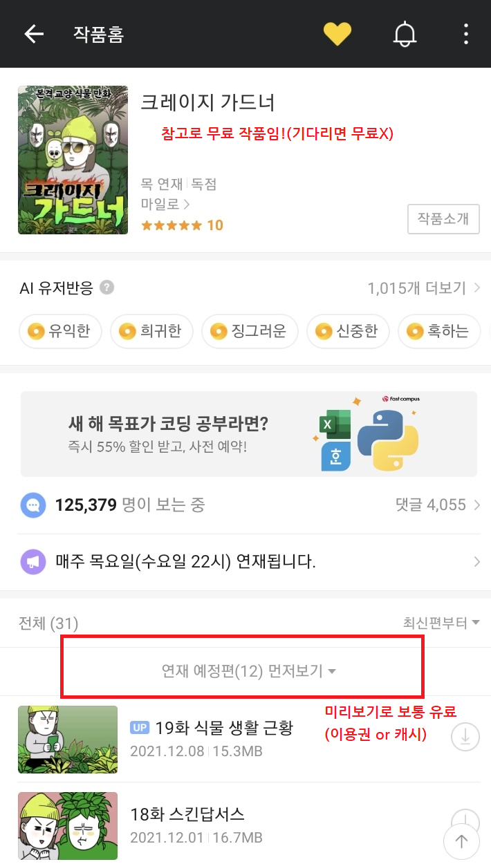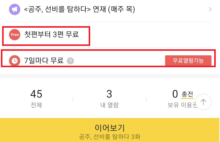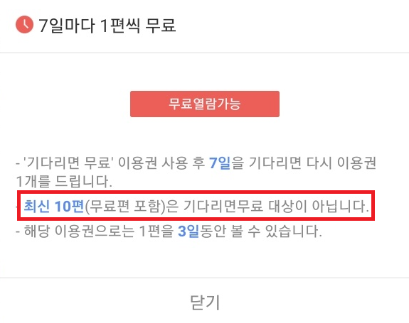 보통 최근 10회 차~n회차 까지는 기다리면 무료를 서비스하지 않고 이용권으로만 열람 가능하다.