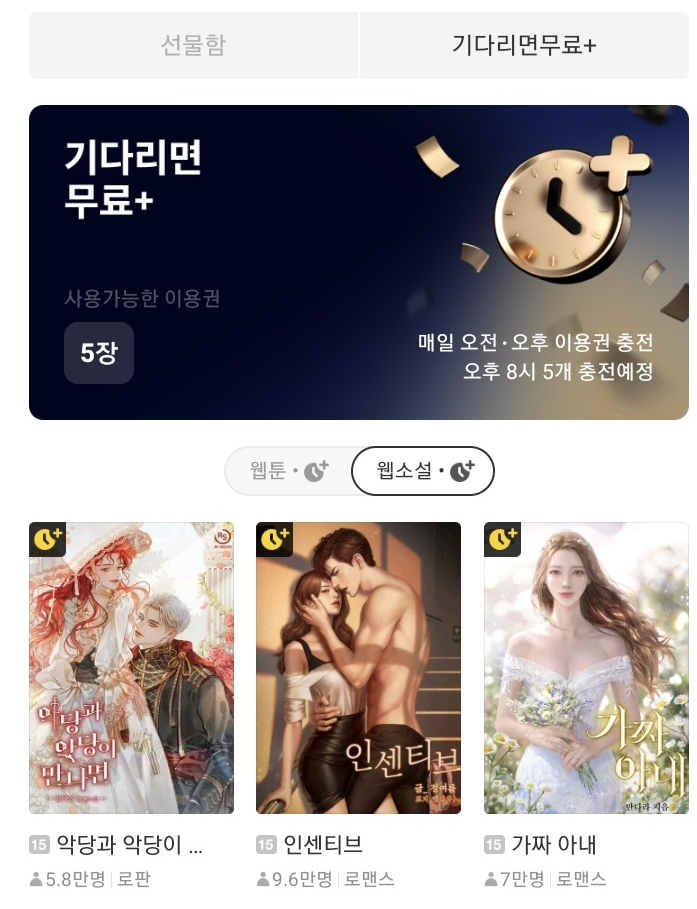 - 기다리면 무료 플러스 : 이건 나도 안 써봐서 모르겠는데 한 번에 여러 회차씩 볼 수 있는 듯함