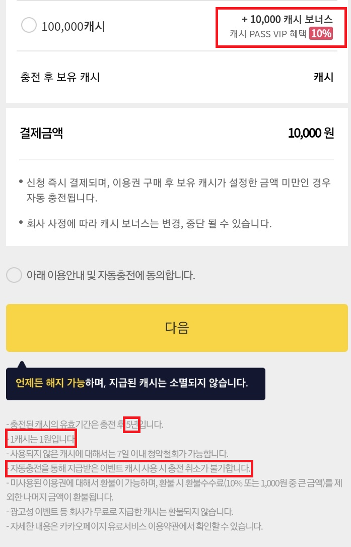 카카오페이지 많은 작품을 보는 사람이라면 십만캐시 충전하고 바로 해지해서 캐시보너스(만캐시)를 냠냠하는 것도 방법이다. (안내글에 "언제든 해지가 가능하며 지급된 캐시는 소멸하지 않는다"고 적혀있다)