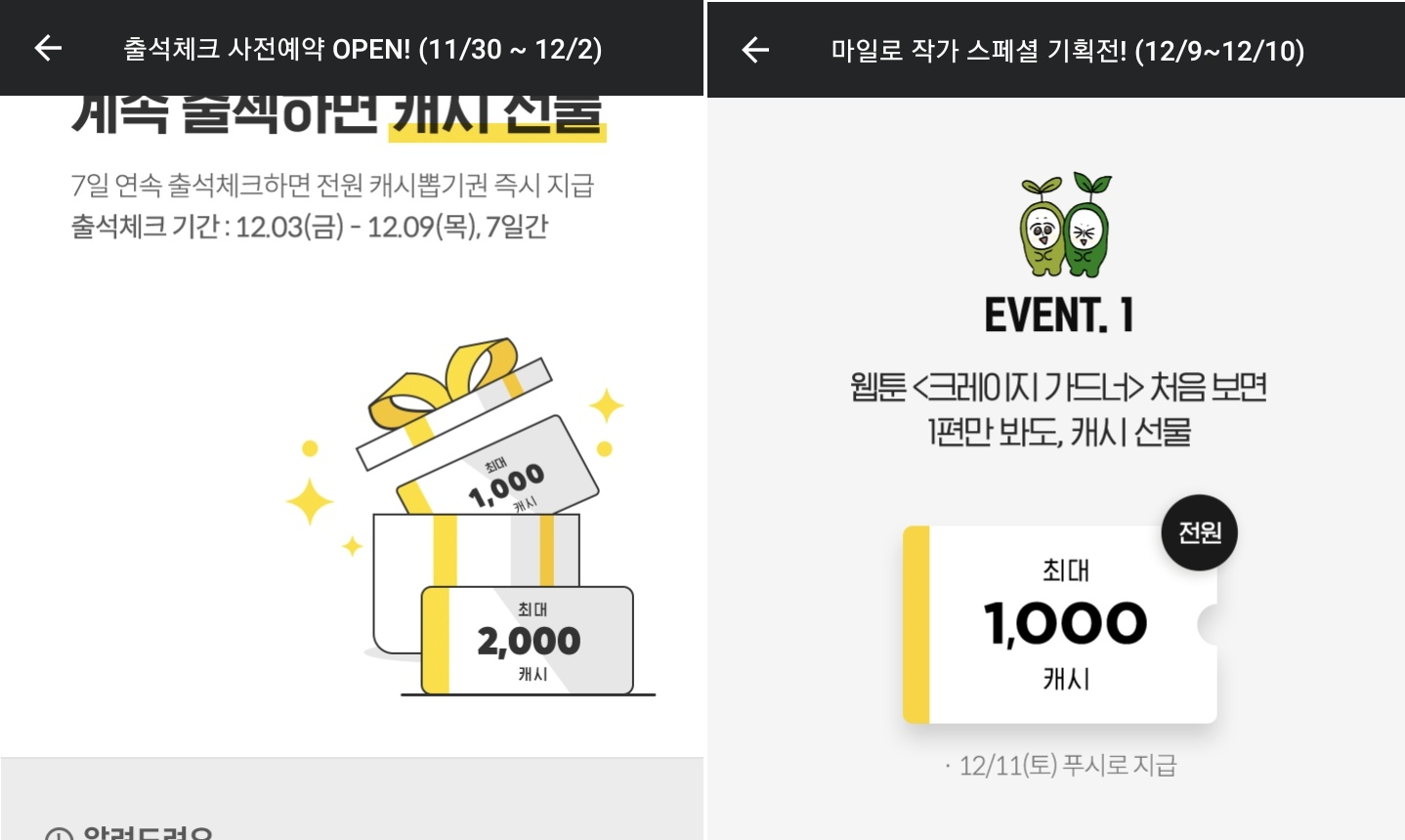 제일 맘에 들었던 방식으로 주는 건 : 웹툰 열람 시 캐시, 카카오 채널 등록하고 캐시