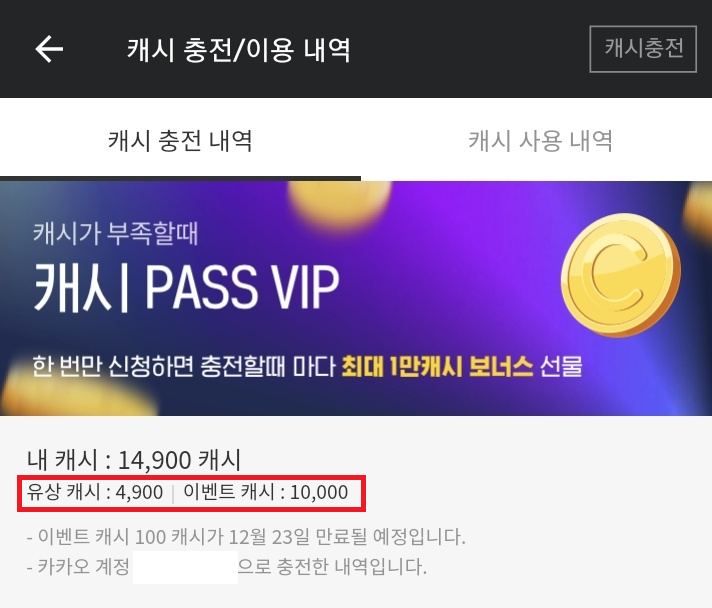 현금(카드)으로 충전한 캐시는 아마 직접적인 유효기간이 없을 텐데 아마 있다면 5~10년이었던 거 같다.(기억이 잘 안나네... 애초에 충전한 내 돈인데 유효기간 없는 게 맞지 않나 싶긴 하다.)