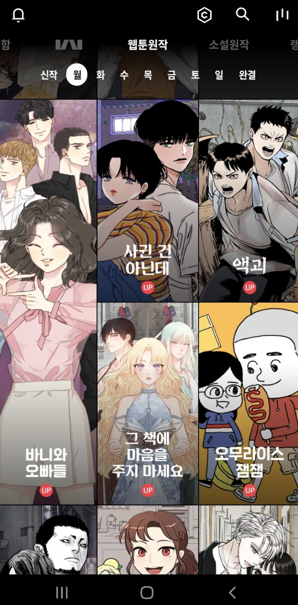 카카오웹툰 들어가서 웹툰원작 탭을 가면 저런 화면이 나온다.