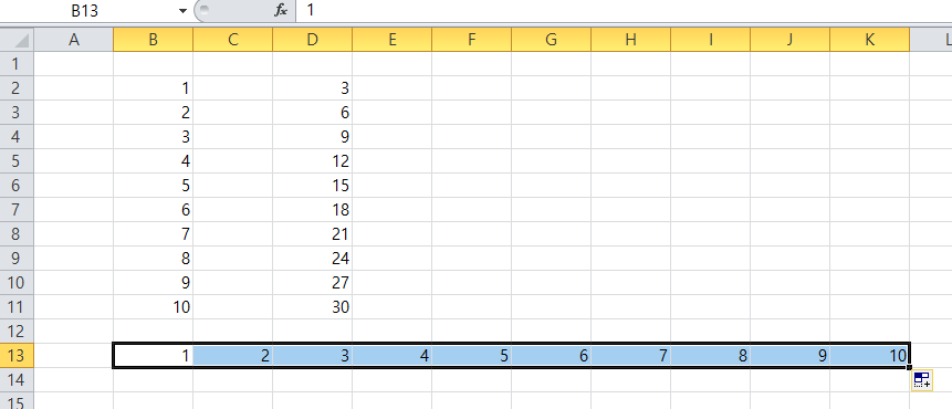 만약 3부터 시작하는 값과 3씩 증가하는 연속된 숫자 열이 필요하시면 다음과 같이 가능합니다.