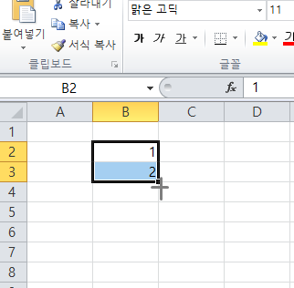 입력한 값(1,2)을 드래그하신 뒤 오른쪽 하단 커서 갖다 대시면 십자가(+) 모양이 나옵니다.