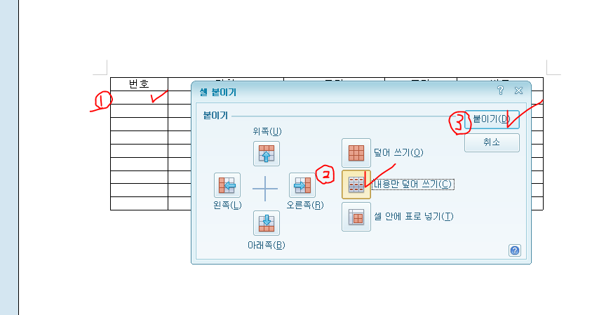 '내용만 덮어쓰기'를 선택하고 붙이기를 누르시면 돼요.