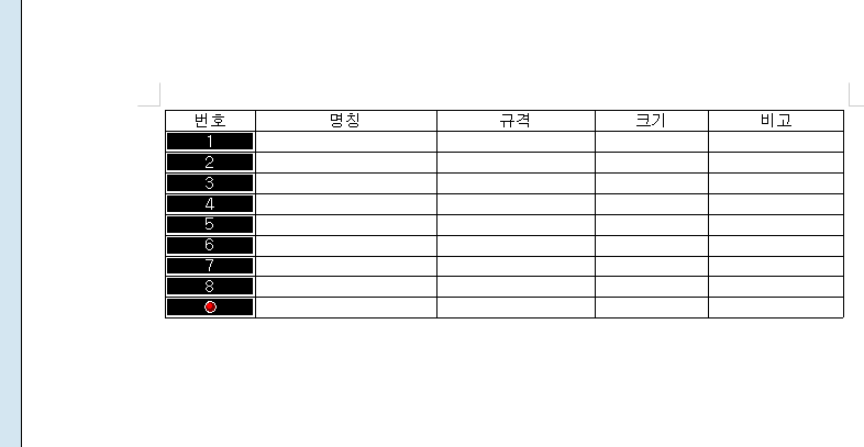 (제 착오로 1행이 부족해서 10까지 못 붙여놨네요... ㅋㅋ 여러분들은 항목 행(번호, 명칭, 규격...)까지 고려해서 +1 해서 표를 만드세요..)