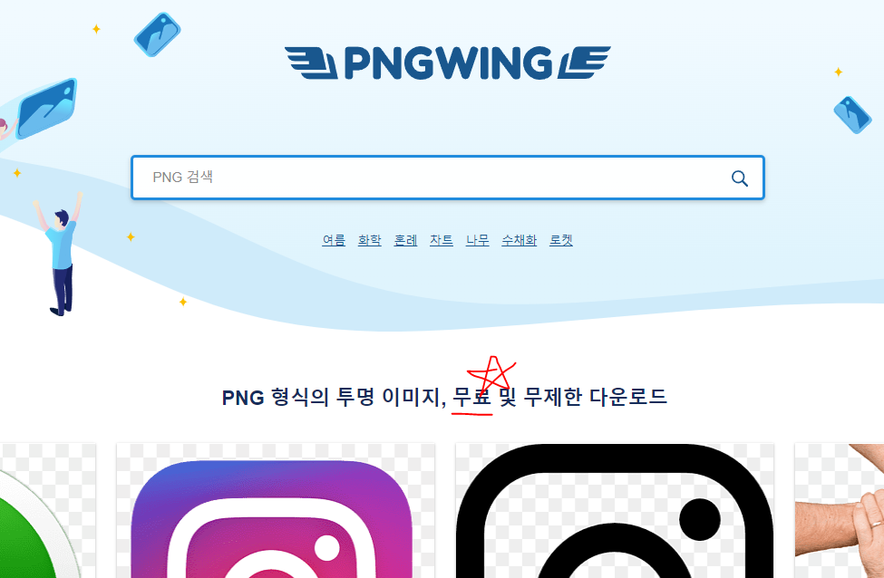 하지만 이번에 발견한 PNGWING 사이트는 완전 무료처럼 보입니다. (이래 놓고 유료 있으면 어떡하지...ㅋㅋ)