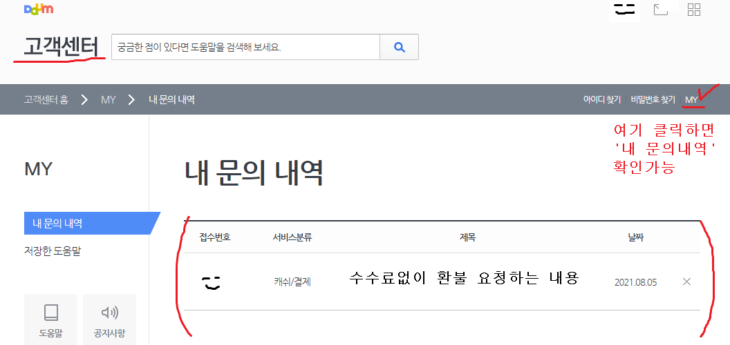 참고로 문의한 내역이 어디있는지 확인하시려면 다음고객센터에 오른쪽 상단 MY로 들어가셔야합니다.