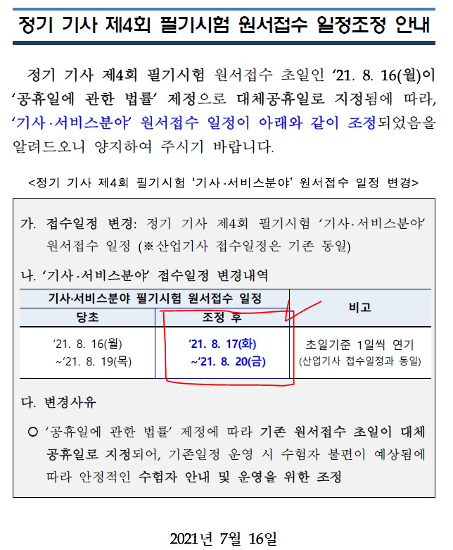"2021년 정기 기사 제4회 필기시험 수험자 안내(0728변경)"라는 공지사항이 있어 들어가 보았고