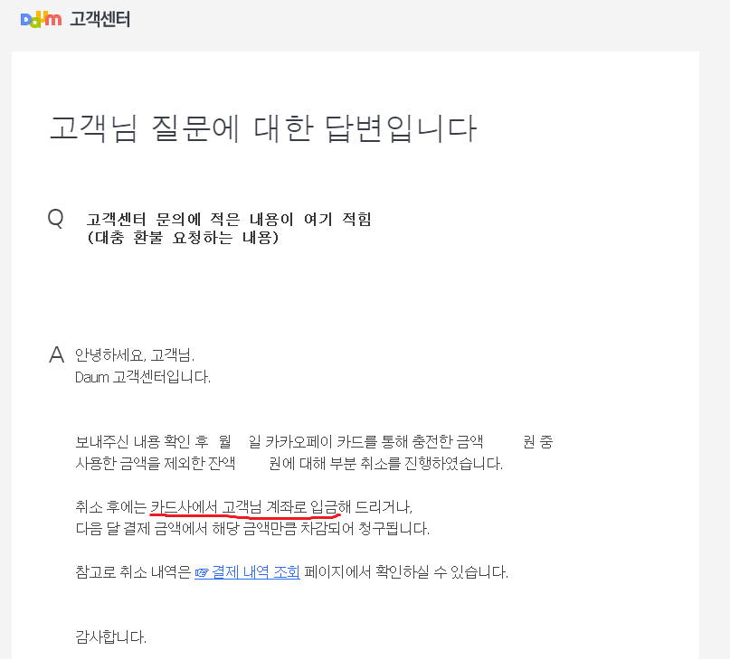 8월 3일(카카오 측), 5일(다음 측)에 문의를 넣은 결과 다음웹툰 캐시를 성공적으로 환불받았습니다.