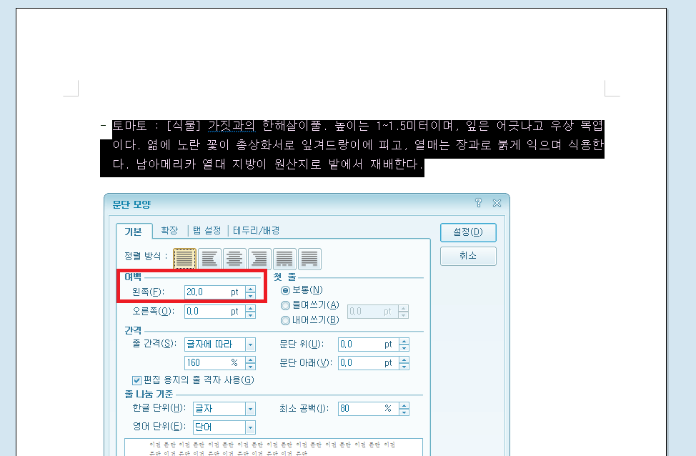 특이점이 있다면 문단 모양에서 여백-왼쪽 항목에 값이 있다는 점입니다.