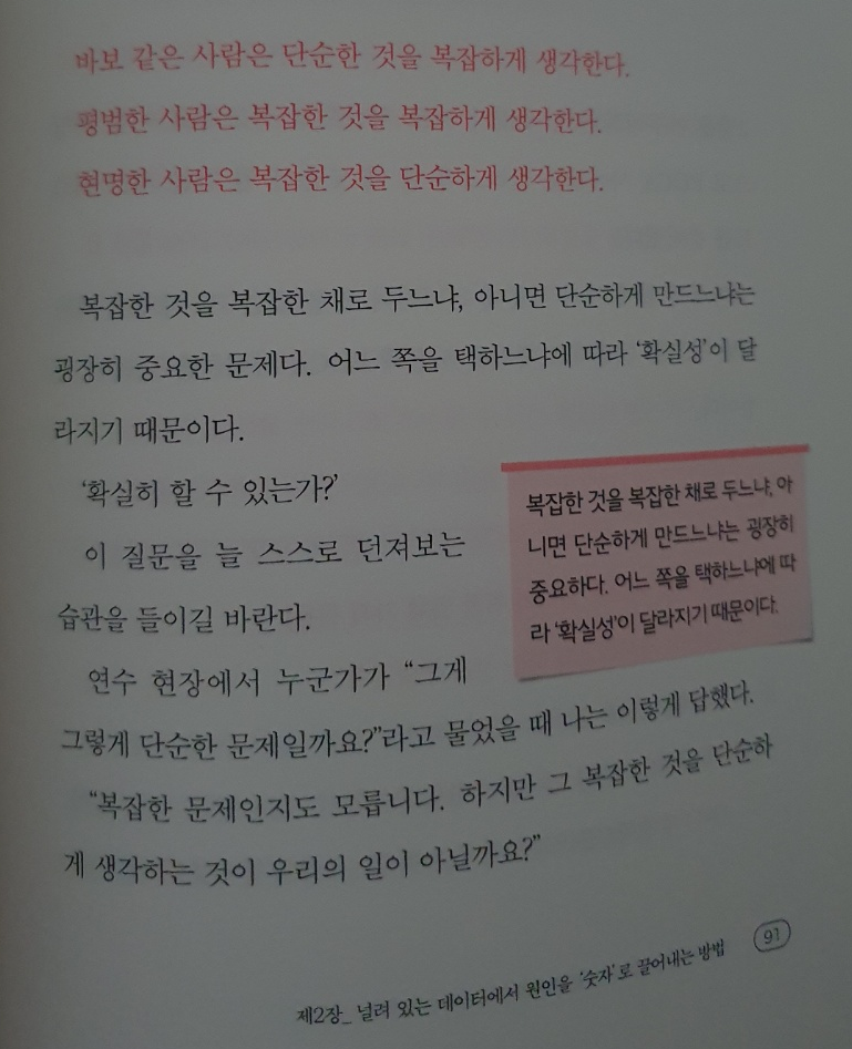 저자는 직장인을 대상으로 일 잘하는 방법으로 '숫자로 생각하기'를 제안한다. 문과나 수학을 싫어하는 사람이라면 '뭔... 숫자로 생각해!'하고 화가 나겠지만 숫자로 생각한다는 것은 계산과는 다른 영역이다. 우리가 편의점에서 물건을 결제할 때 '5000원입니다.'라고 듣는 상황을 생각해보자. 사회인 정도 됐으면 아무도 5000원, 이라는 단어를 이해하는데 어려움을 느끼지 못한다. 그렇다면 당신은 '숫자로 생각하기'를 충분히 할 수 있는 여력이 되는 것이며 연습만 하면 된다. 우리는 수학을 어려워하지만 그것은 복잡한 계산식을 푸는 것을 어려워하는 것이지, 숫자 자체를 어려워 하는 게 아니다.