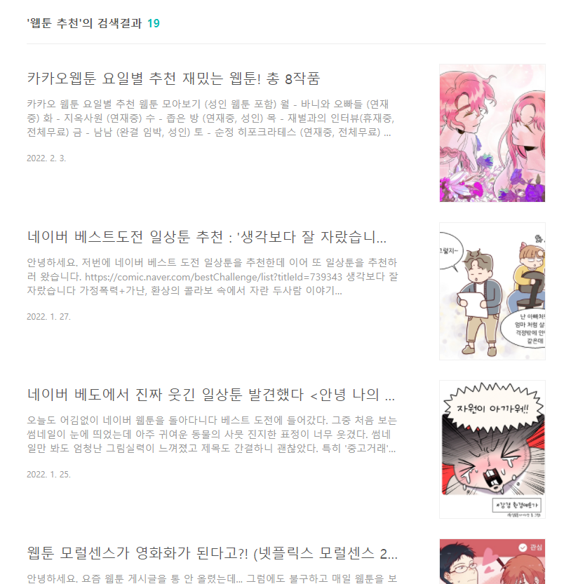 '웹툰 매일 봄'이라는 카테고리 안에 웹툰 추천글이며 웹툰 이용법이며 섞여있는 상황입니다.