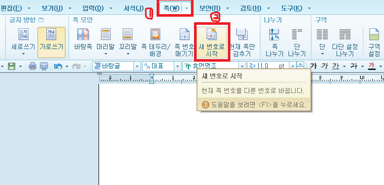 한글 '쪽'탭에서 '새 번호로 시작'을 클릭한다.