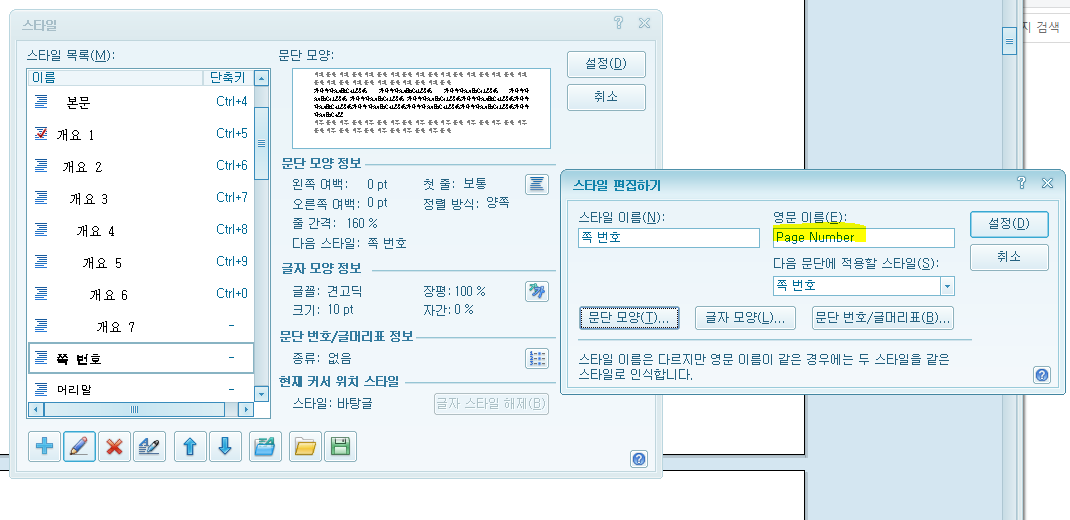 * 그래서 영문 이름 Page Number인 스타일은 쪽 번호 외의 용도로 사용하지 말 것. 만약 스타일 이름(한글)을 다른 걸로 변경하여 페이지에서 사용하면 정작 쪽번호 넣을 때 원한 글꼴의 형태가 아닐 수 있음.