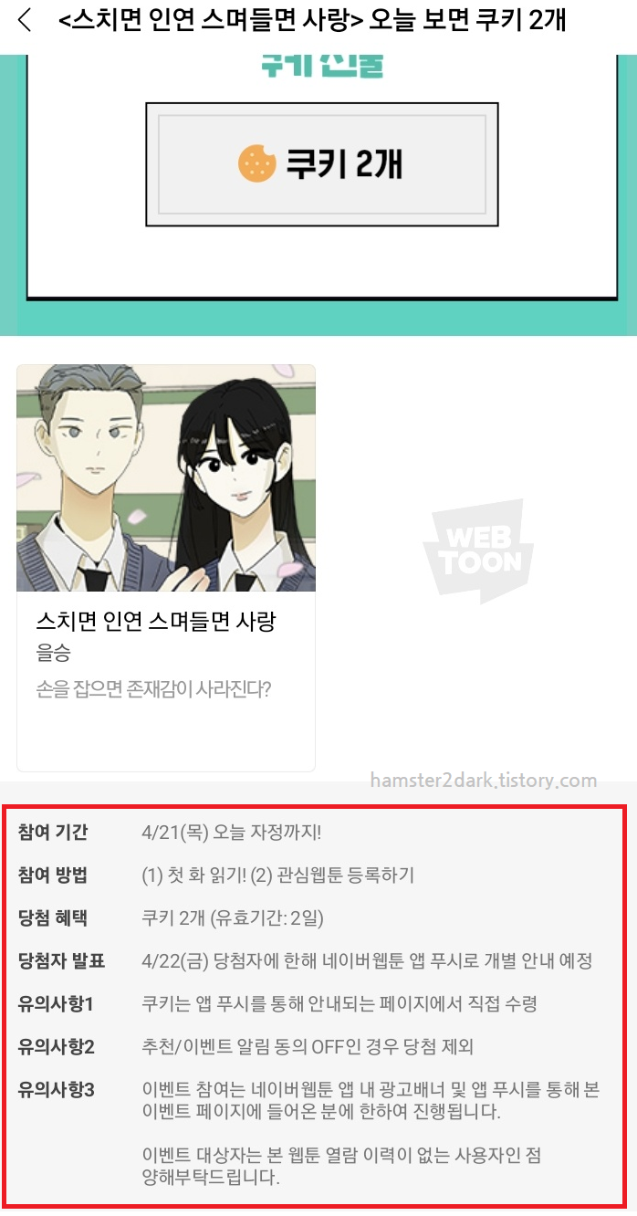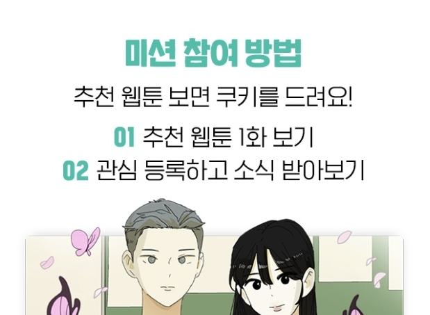 네이버 웹툰 모바일 어플에서 이 작품 아직 안 보셨길래 추천 <웹툰 제목> 오늘 보면 쿠키 2개