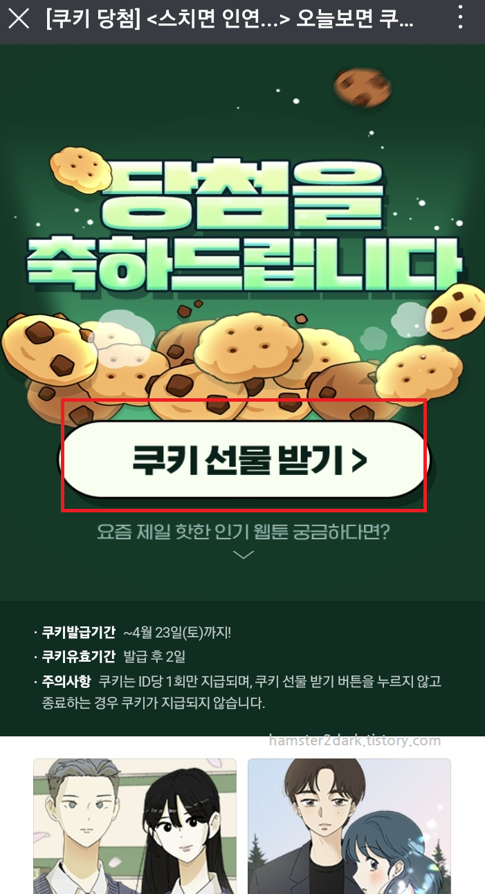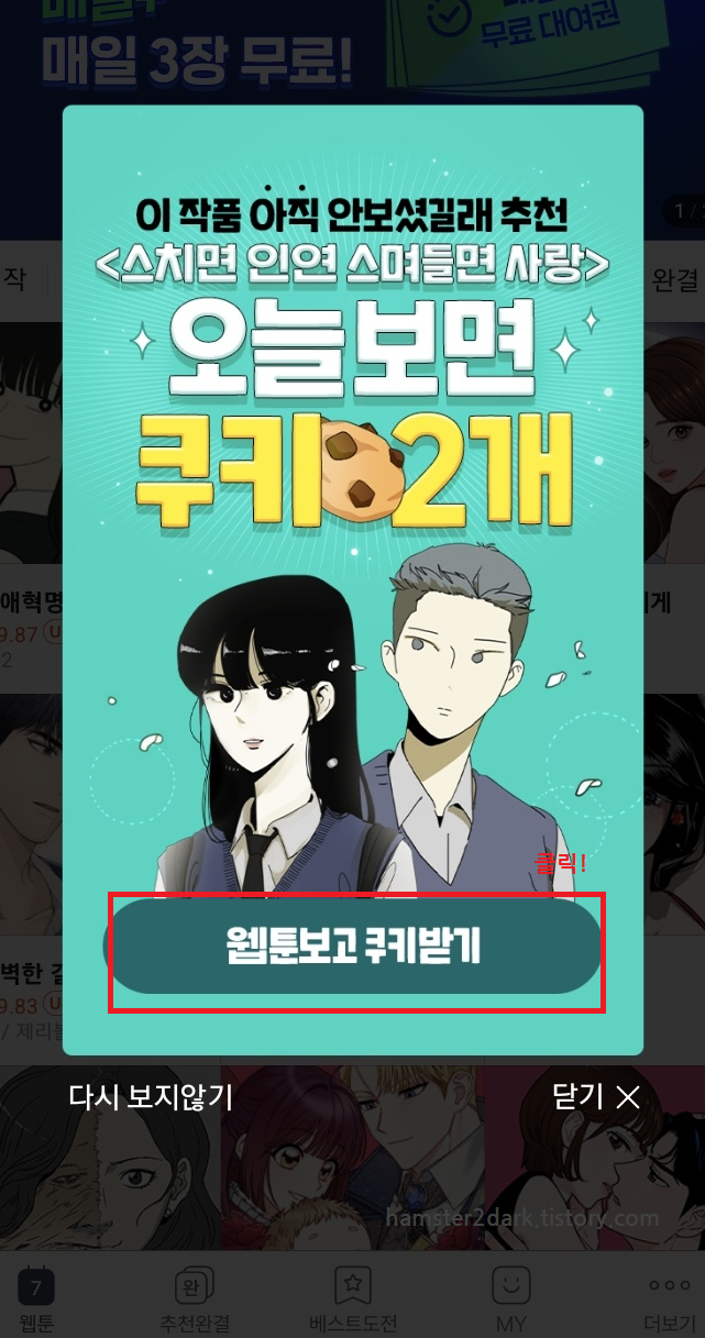 창이 뜨면 '웹툰 보고 쿠키 받기'를 눌러줍니다.