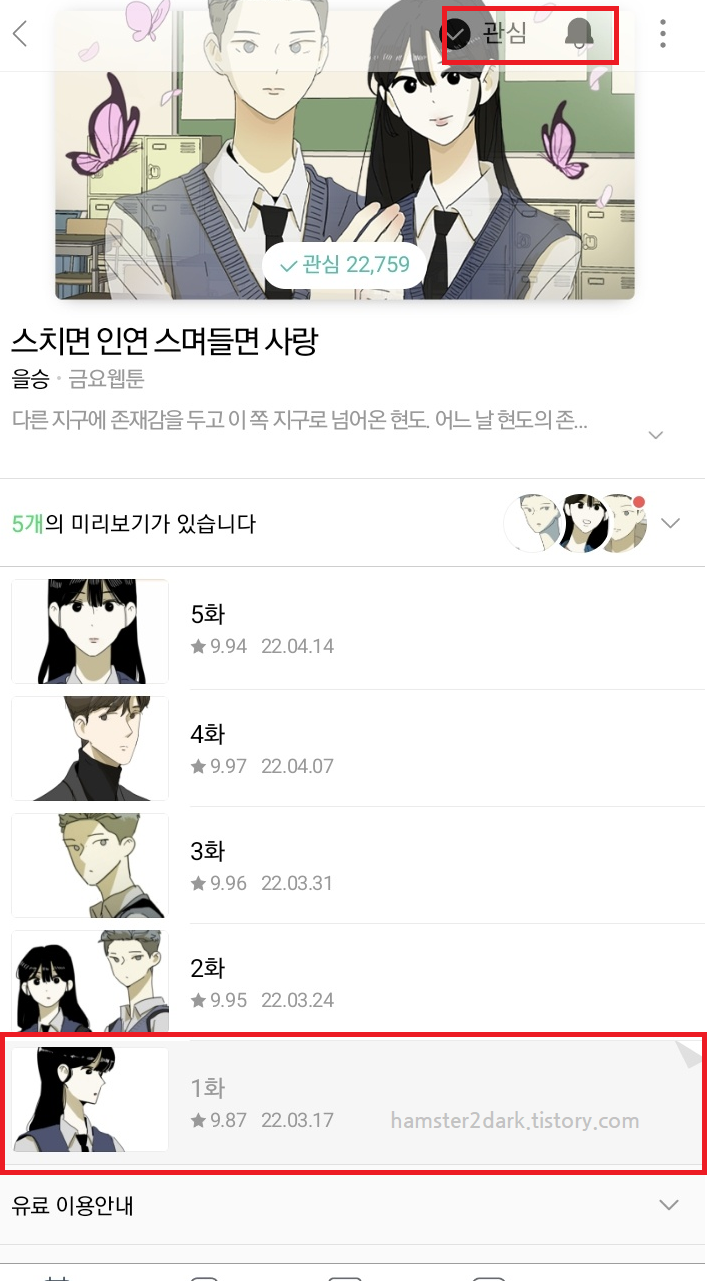 2. 안내에 따라 해당 웹툰 1화 읽기 & 관심 등록