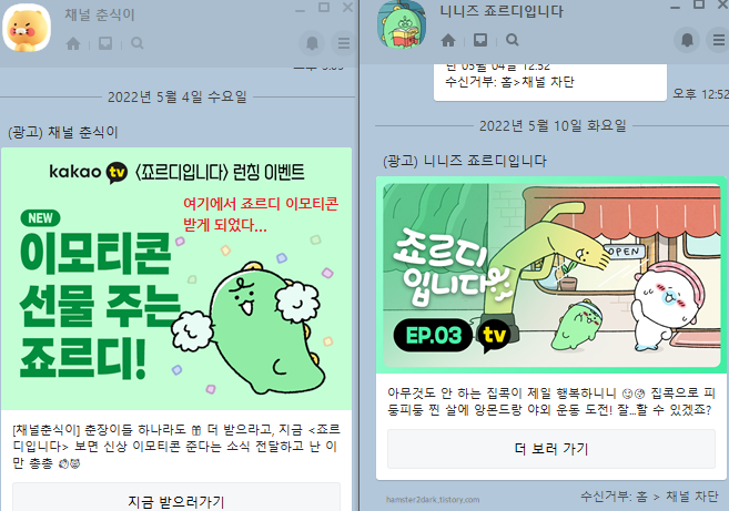 지금도 주는지는 모르겠지만 아주 간단하게 채널 추가하고 카카오 티비 죠르디 편 하나 보고 얻었습니다.