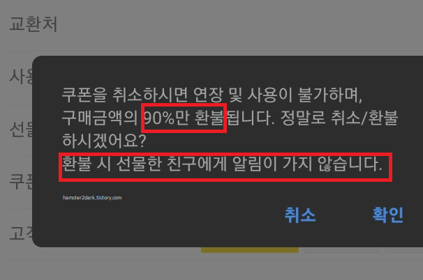 (기사 내용 보면 구매자의 경우 일정 기간 내 100% 환불 가능하지만 수신자는 무조건 10% 떼는 듯.. 받은 지 얼마 안 된 선물이 없어서 확인은 못해보겠지만, 첫 유효기간 전에는 수신자도 100% 환불 가능성이 있으려나... 있었으면 이미 진작 많은 사람들이 기프티콘 중고로 안 팔고 빠르게 환불했을 듯)