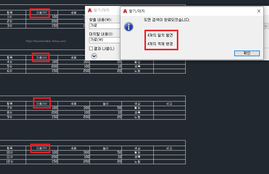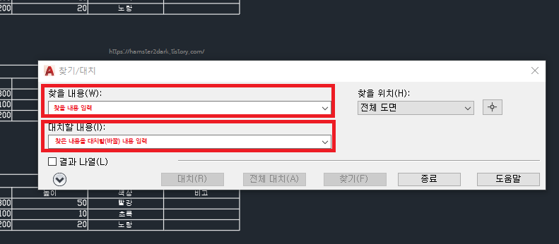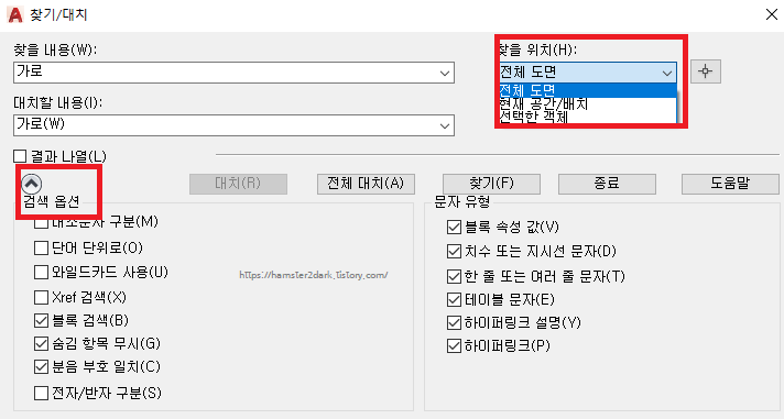 더불어 찾을 위치를 통해 '전체 도면', '현재 공간/배치', '선택한 객체' 중에서 하나 선택할 수 있으니