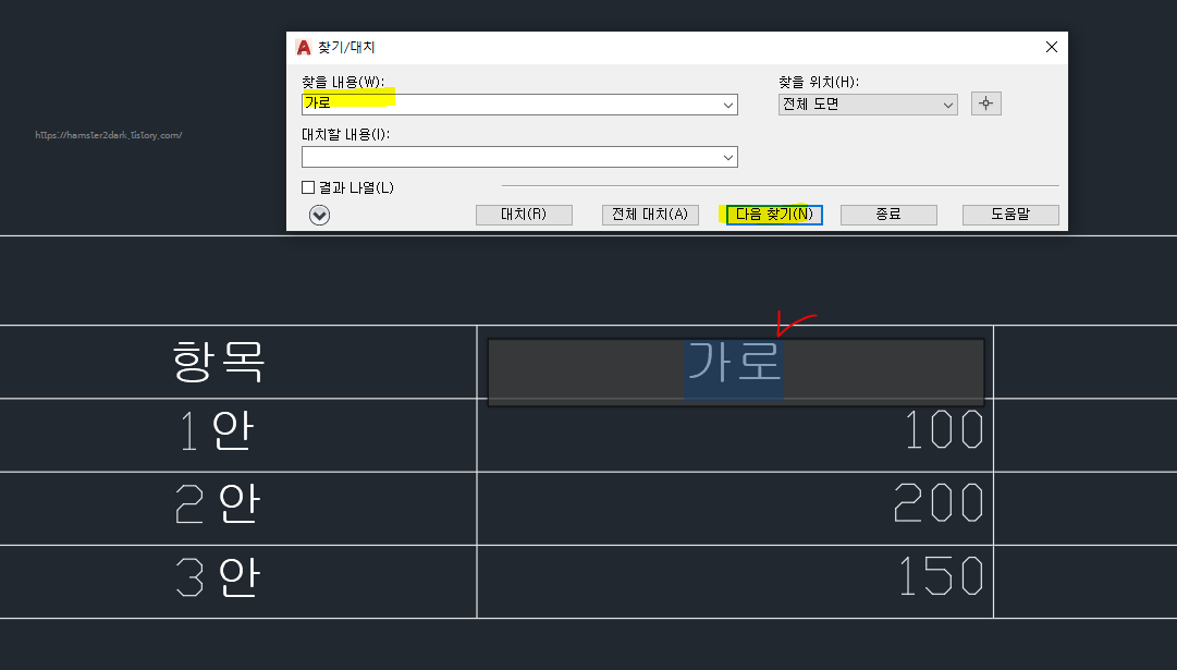 그전에 가로의 위치를 확인할 겸, 찾을 내용에 '가로'를 넣고 찾기를 누르면 위치를 찾아주며 다음 찾기 버튼이 활성화됩니다.