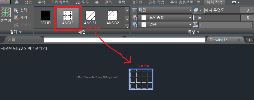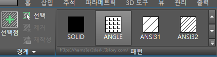 그다음에 hatch 명령어를 입력하여 패턴을 선택한 다음 도형(선을 잘 클릭)을 눌러줍니다.
