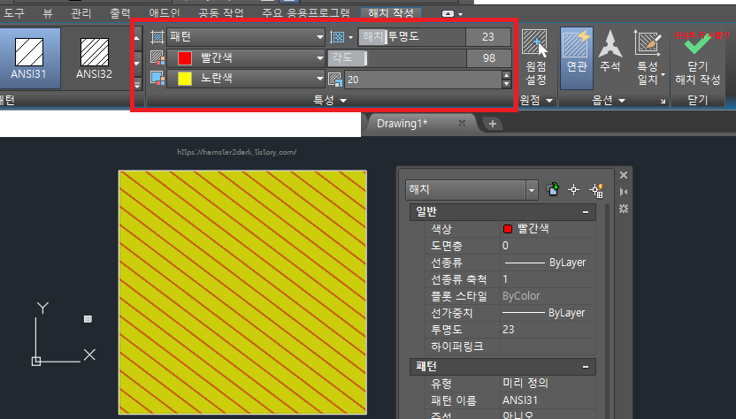 캐드(Auto CAD) : 해치(hatch, 색상 채우기) 투명도 조절하고 프린트(PDF)에도 적용하는 법(with. 그리기