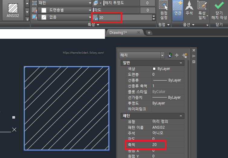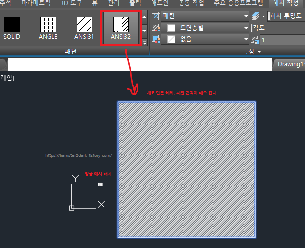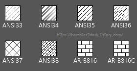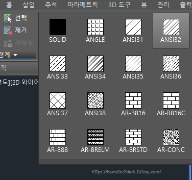 제가 사용한 빗금은 ANSI32인데 그 왼쪽의 패턴(ANSI31)은 좀 더 전형적인 빗금 패턴이네요.