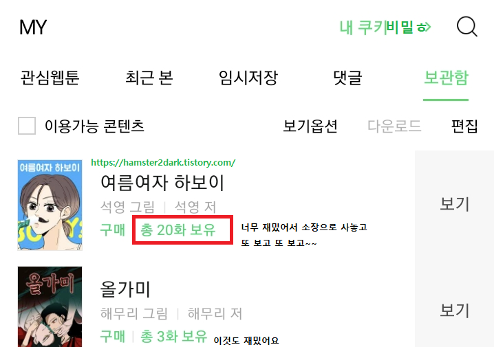 위 사진은 제가 여름여자 하보이 소장으로 20화 보유했다는 증거고요.