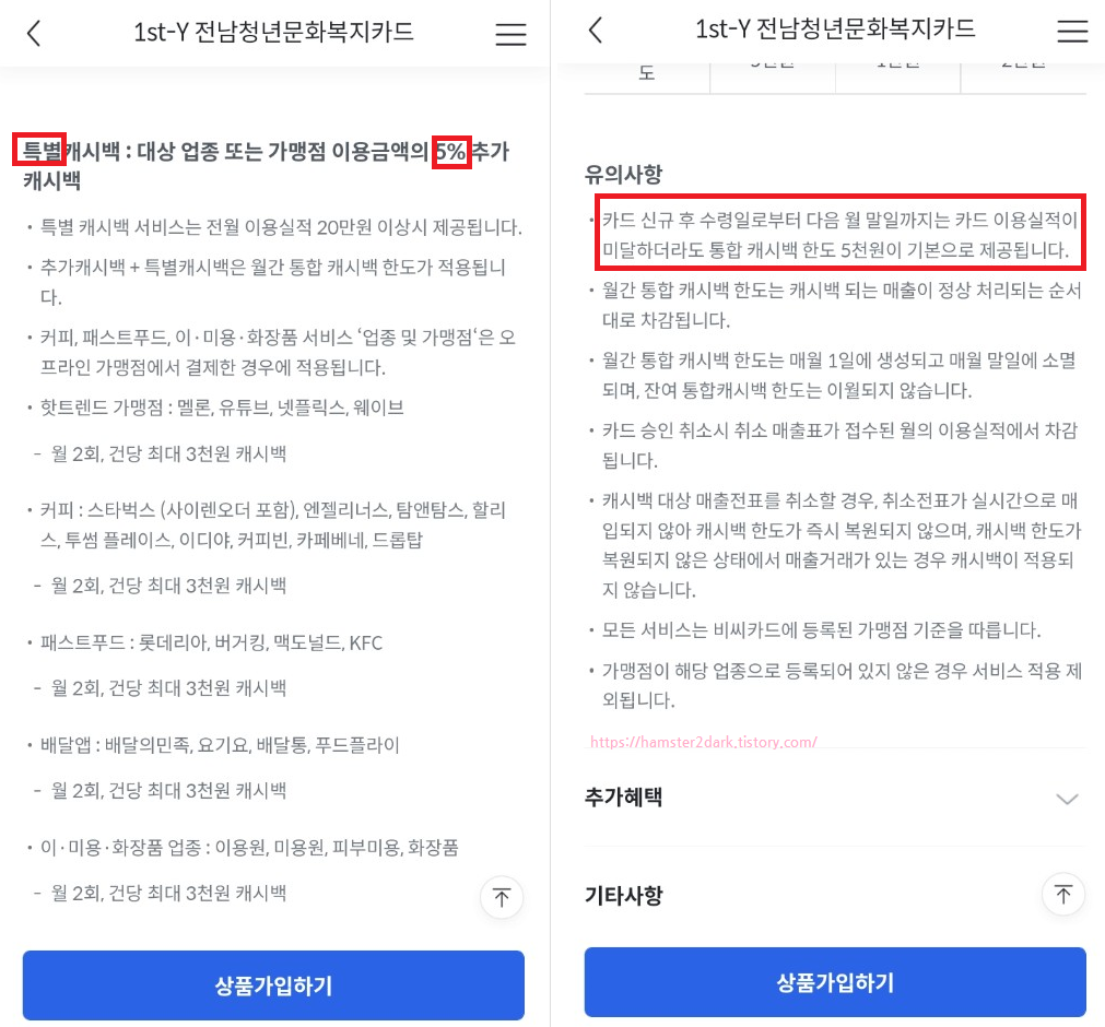 5% 캐시백인데 보통 건당 최대 3천 원에 월 2회로 제한되어있네요. 5%로 3천 원을 받으려면 6만 원은 결제를 해야겠네요. 월 2회니까 3만 원씩 두 번 결제하면 뽕뽑는 구조...