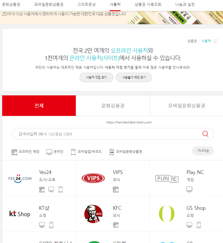 (사용처 링크 : https://www.cultureland.co.kr/voucher/voucheruse.do)
