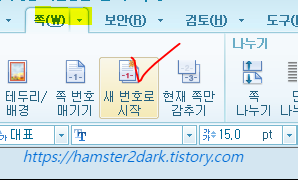 상단 메뉴의 '쪽' - '새 번호로 시작'을 눌러주세요.