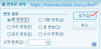새 번호로 시작 창에서 위 사진처럼 설정하고 '넣기'를 하시면 -1-부터 시작하게 됩니다.