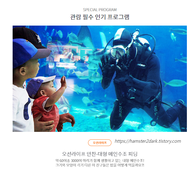 아쿠아리움 프로그램으로는 먹이주기, 마술쇼 등을 시간 맞춰 관람하실 수 있습니다. (팸플릿 참고)